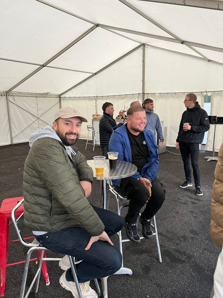 Shelter can now be found at the bottom end of the ground in a stand that looks like it has come straight off a cargo ferry, and a marquee that looks like something from a Cold War Steve piece. The marquee is a fascinating place offering table football, some seating, and a selection of drink, that much to the annoyance of Bargey, did not include lager. Not wishing to die of thirst he made the best of a bad situation and elected for the only other rational choice of a half pint of rosé. If his choice of drink was unexpected, what came next on the pitch was even more of a surprise as from pretty much nothing, we took the lead.