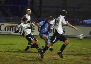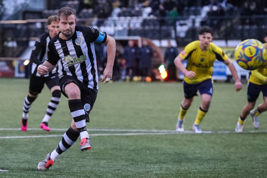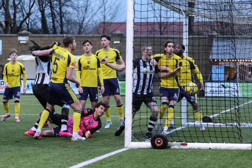 From this point onwards, the game was very open, bloody entertaining, and included moments of quality that I’d describe as variable. Wayne came on for a bloodied Crosbie, who by this point resembled a boxer more than a footballer with a nose that he can’t have been able to use to breathe as nature intended, and Pards almost put us 3-2 up as he saw his strike hit the post. But the go-ahead goal was not long in coming as Corby’s corners once again started to pay dividends. Now, this was a goal that was credited to Wayne, but from our vantage point behind the goal, it looked as though the Havant keeper mistimed his punch and the ball spun off his hand and into the net. Having not seen a keeper punch a corner into their own net since I did the same thing in a DPL game in 2012, I’ve seen it twice in two home games as Gez and now Lorenz Ferdinand have done the same, and at the same end of the ground. I’m sure Ferdinand won’t want to claim it as his own though, so Wayne is welcome to it.
