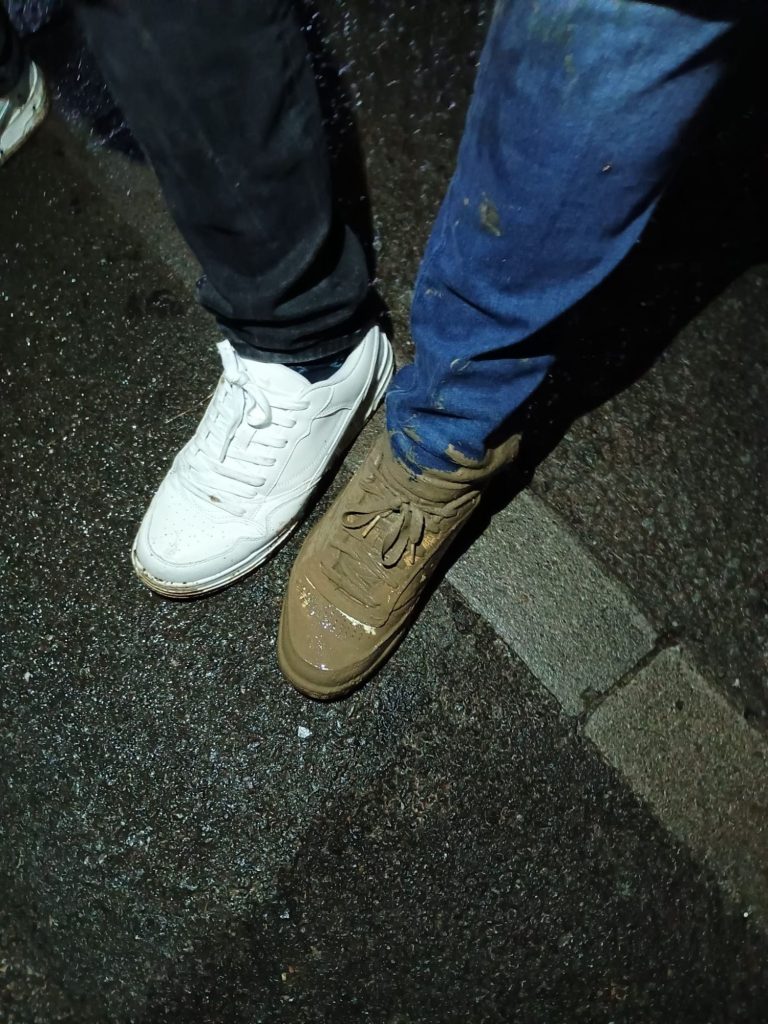 We headed back to the bar, JP had some chips and curry sauce which appeared to be raw chips that were hopefully going to cook in the molten sauce, more Bluebell lager was consumed, and given how close the brewery and taproom were, we decided to head there for a celebratory pint or two. This seemed a good idea, but some Heras fencing panels seemed to block the most direct path. “No worry, we’ll take a shortcut down the side”, says Jason. So off he went with Columbo in his nice new Reeboks behind. And once Columbo went off the duckboards, his feet were fully absorbed by the mud of no-mans-land and he absolutely stacked it, ending up ankle deep in mud and propped up by the fence. If this wasn’t bad enough the shortcut wasn’t even viable, so he had to come back the other way, fell over again, and ended up with a potentially torn hamstring as well as a suspected case of trench foot. Good shoes didn’t save him this time.